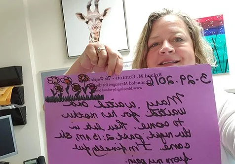 The discovery of a Purple Paper often unfolds in the most remarkable ways. At Roland’s events—whether in-person or virtual—he may suddenly recognize a connection between a prewritten Purple Paper and someone in the audience. He has no prior knowledge of who the intended recipient will be. Yet, days or even months after the paper is written, a name, an object, or a life circumstance opens the door. In that moment, a message of love is delivered to someone in need, bringing comfort and validation.