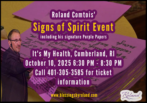 Roland Comtois’ mission is to touch as many souls as possible with messages that bring hope, peace and love. Though most audiences are small in size, not everyone is guaranteed a reading, message or Purple Paper, but everyone participates in an “experience” that changes minds and hearts. Random audience members will receive messages.